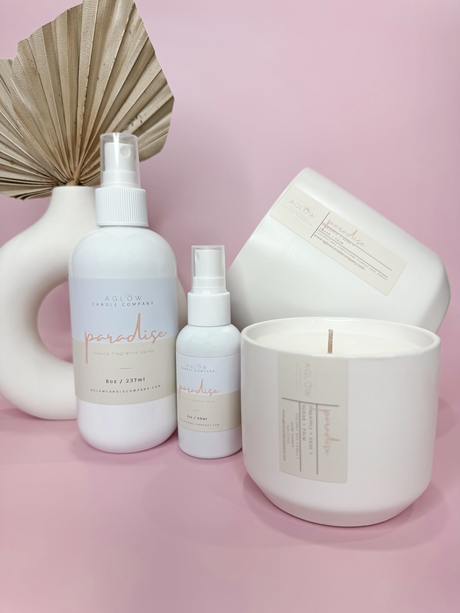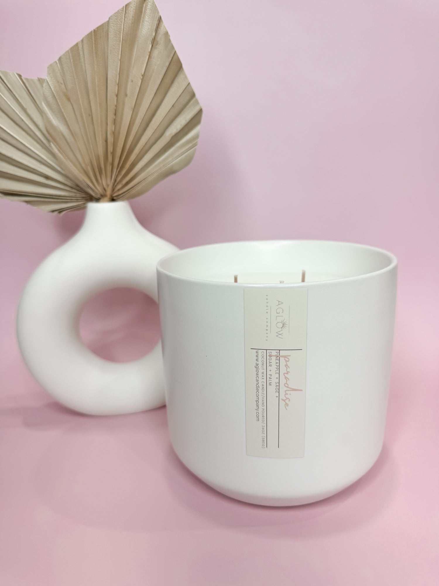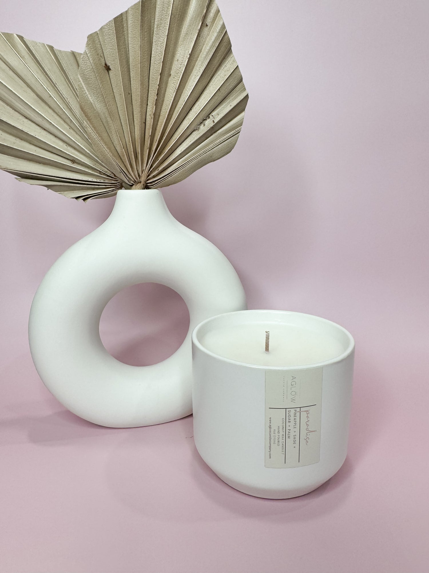Choose from a 6oz (40hour burn time) or a 24oz (160 hour burn time) ceramic vessel filled with the tropical scents of Pineapple + Sage + Sugar + Palm. This scent has fresh cut pineapple top notes that combine with an earthy sage and sweet sugar. Coordinating fragrance sprays available!
